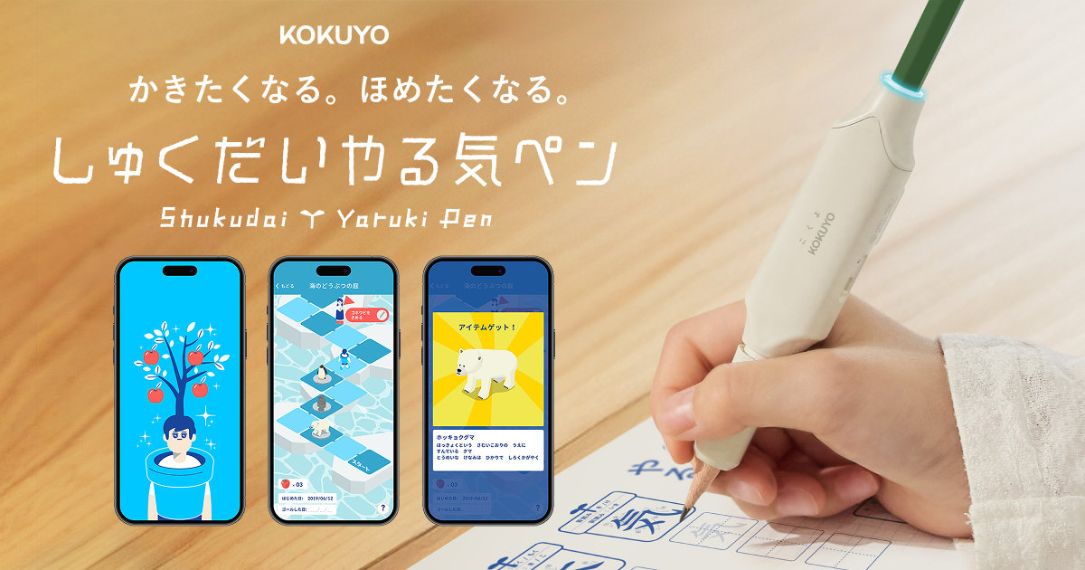 「しゅくだいやる気ペン」は、市販の鉛筆に取り付けるだけ。スマホアプリと連動させて家庭学習をの習慣づけをサポート。